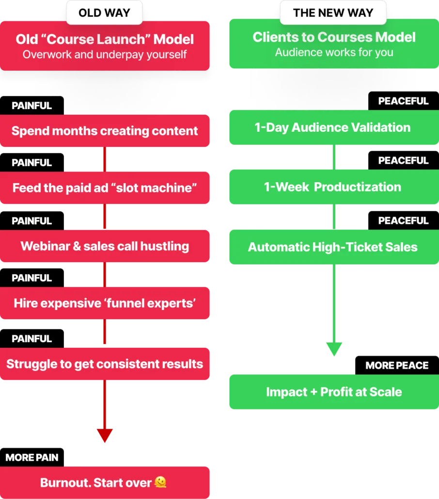 Clients to Courses gives you a product and sales engine rooted in your uniqueness, then uses AI to amplify your impact, not replace it.