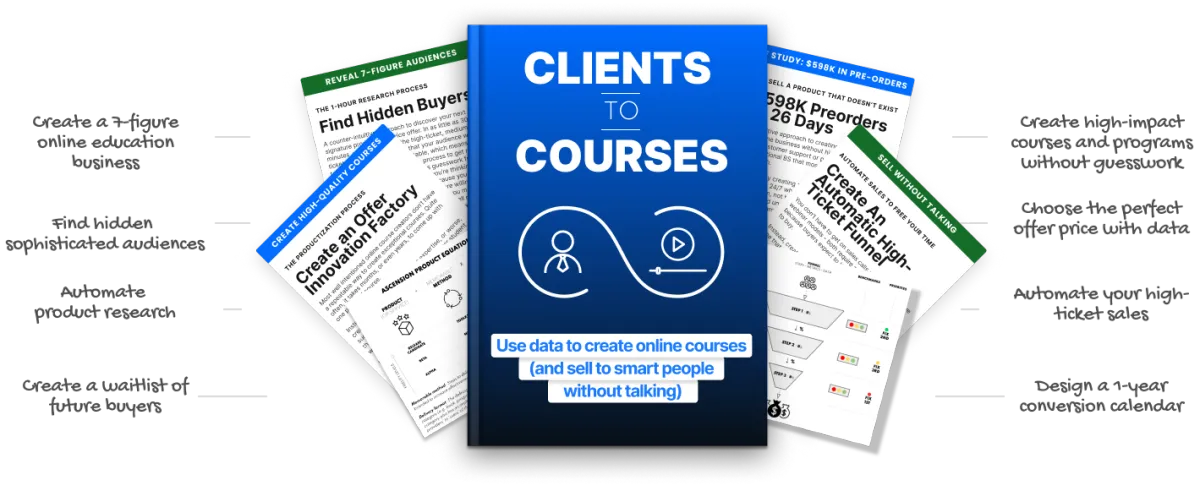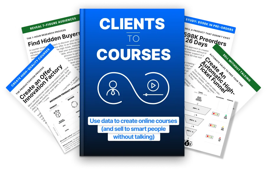 For $5 today, you’ll download the complete Clients to Courses system and take the first step toward building what AI can't replicate, competitors can't copy, and clients choose without hesitation.